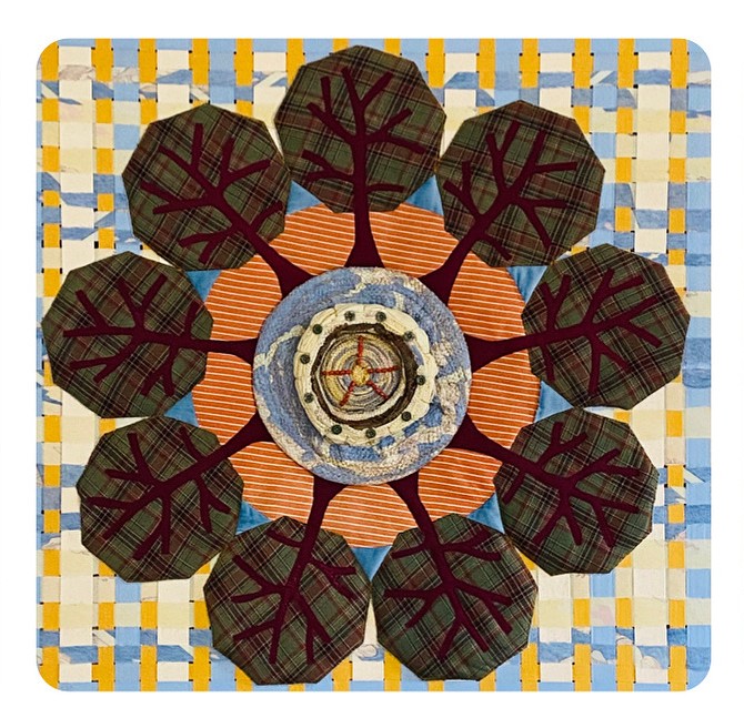 Deze Cirkel van Stof is opgebouwd uit repen van een favoriete dekbedhoes, die tot een nieuw geheel zijn geweven en zo de achtergrond vormen (1×1 m).