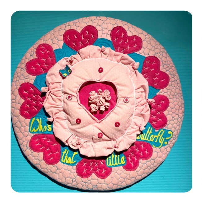 Op 15 juni 1990 werd zij geboren, een klein meisje dat slechts enkele dagen bij hen mocht zijn. Van twee zorgvuldig bewaarde babypakjes groeide deze herinneringscirkel (30 cm Ø), draad voor draad, steek voor steek, tot een tastbare herinnering in liefde.