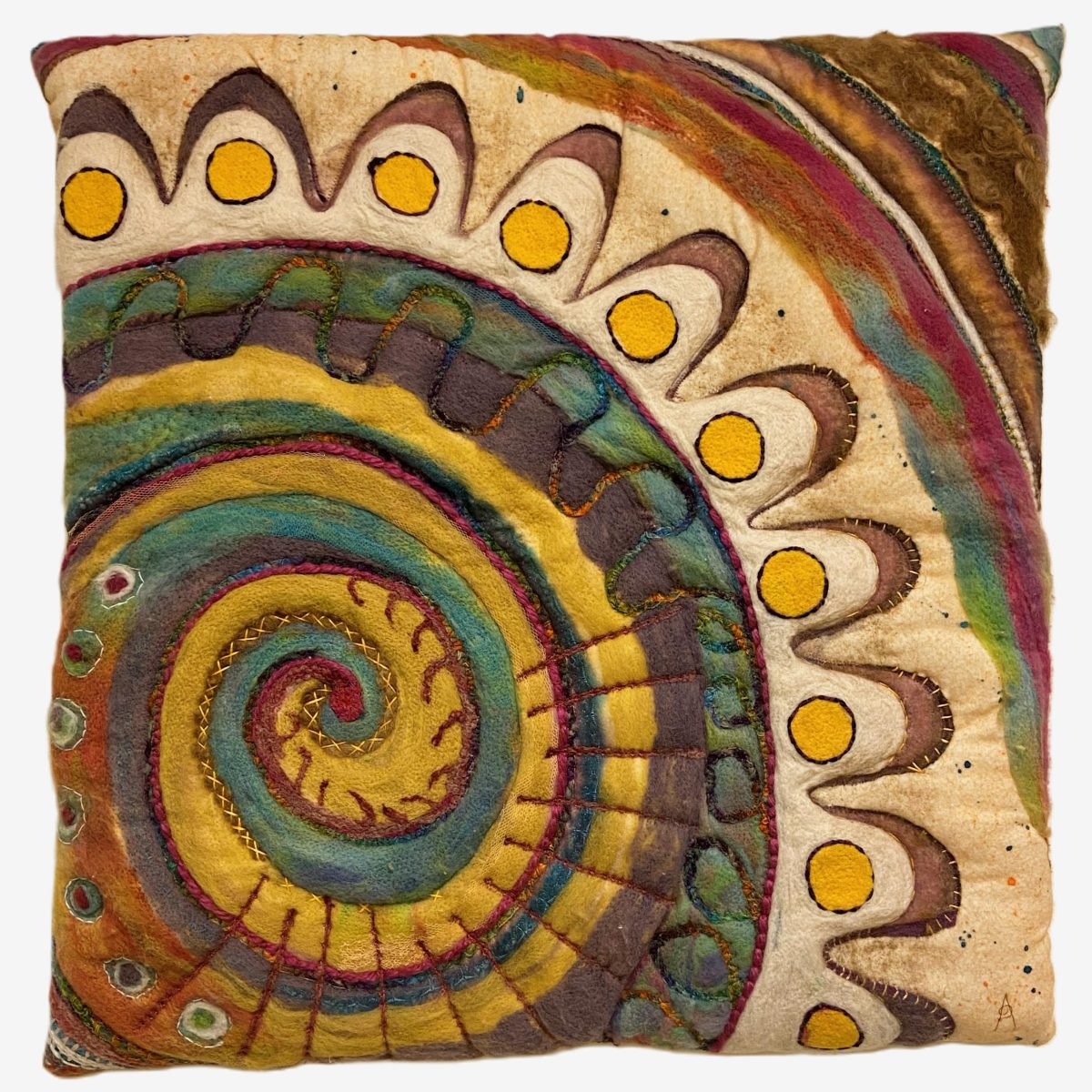 Ode aan Joy is opgebouwd uit natuurlijk geverfde wol op een flanellen ondergrond. De organische vormen, spiralen en kleuren vloeien in elkaar over en geven het werk een levendige, bijna ademende uitstraling.