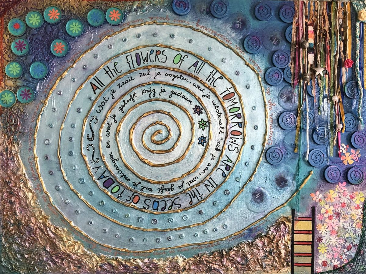 De tekst “All the flowers of all the tomorrows are in the seeds of today” herinnert eraan dat alles wat wil groeien, al aanwezig is in het nu.